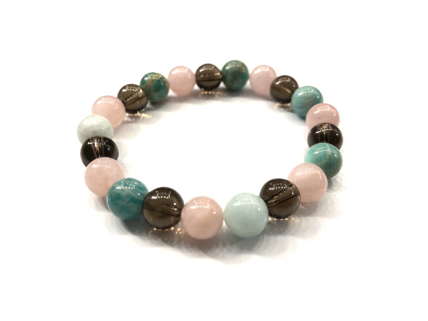 Le Bracelet « Contre les Tendance Dépressives » en perles 08MM alie les vertues de l’Amazonite, de la Morganite et du quartz enfumé