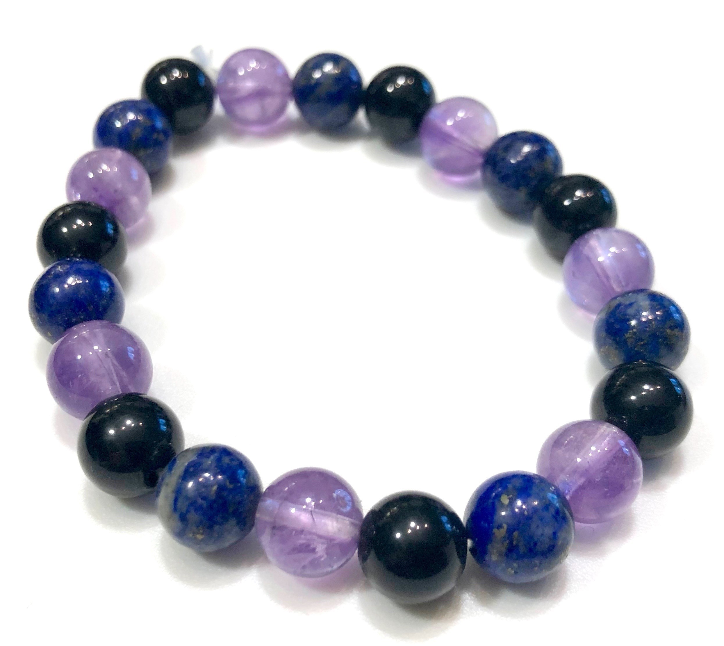 L’améthyste travail à détendre l’esprit, jouant sur les pensées obsessionnelle qui finissent par nous donner « mal au crâne ». La tourmaline noire nous protège des facteurs électromagnétiques (Wifi, hertzien, électroménager…), et à la particularité de recentrer nos énergies internent : l’ancrage au sol qu’elle renforce permet d’évacuer les trop-plein vers la terre. Le lapis-lazuli, quand à lui, va travailler sur les effets du stress, en les diminuant grâce au renforcement du calme intérieur.