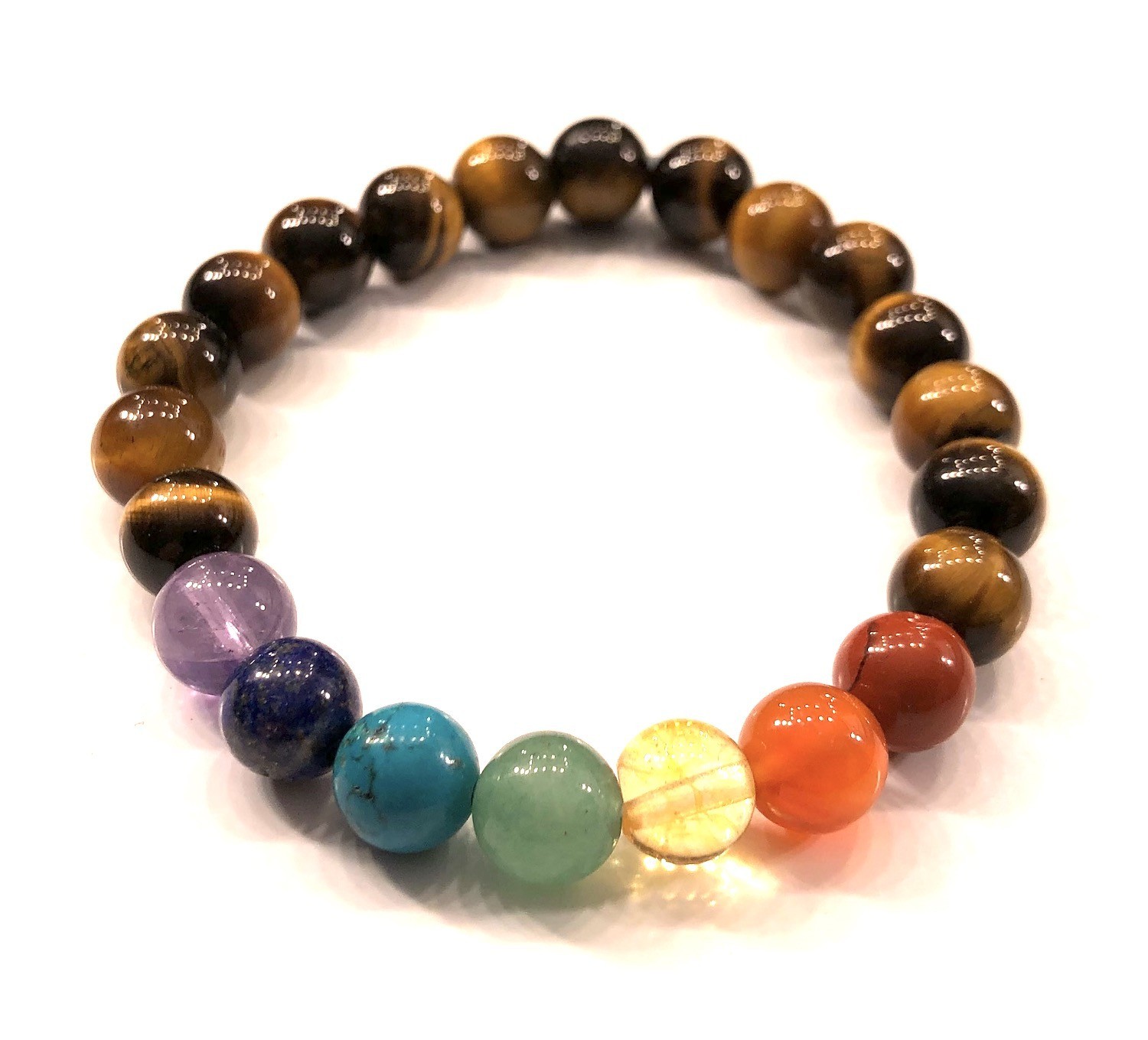 Bracelet élastique en pierres naturelles composé de perles en Oeil de Tigre et de 7 perles aux couleurs des 7 chakras principaux :