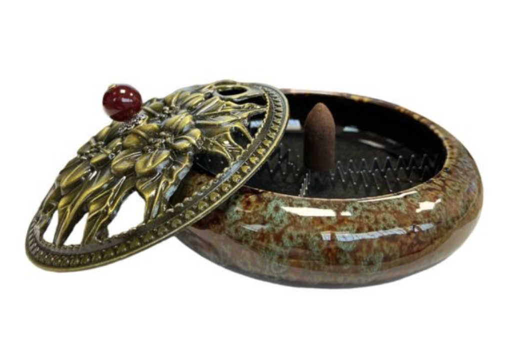 Brûle encens Céramique marron et bleu avec tapis ininflammable