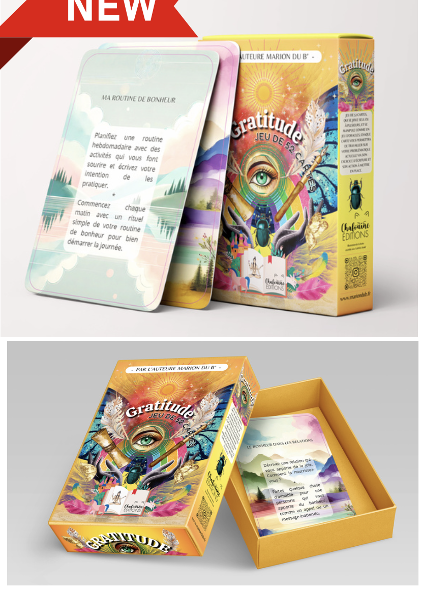 Inspiré par les thèmes de la gratitude, de la joie et de l’éveil spirituel, ce jeu vous accompagne dans un cheminement intérieur vers la paix, la connexion avec soi et l’harmonie. Marion Du B’, auteure de la saga « la Thérapie par le rire », vous invite à entreprendre un voyage introspectif où chaque carte devient une ouverture vers le bonheur, la sérénité et la transformation spirituelle.