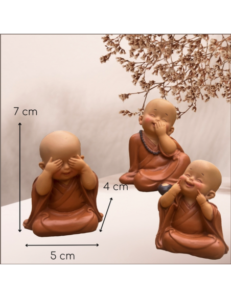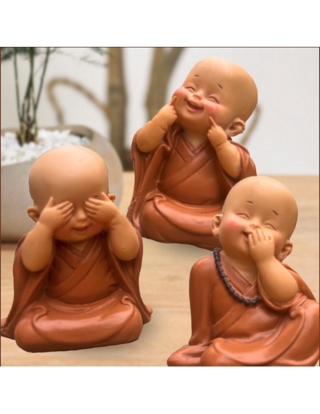Ce trio de bébés bouddhas bonzes adopte des positions et des mimiques inspirant la bonne humeur et la joie.